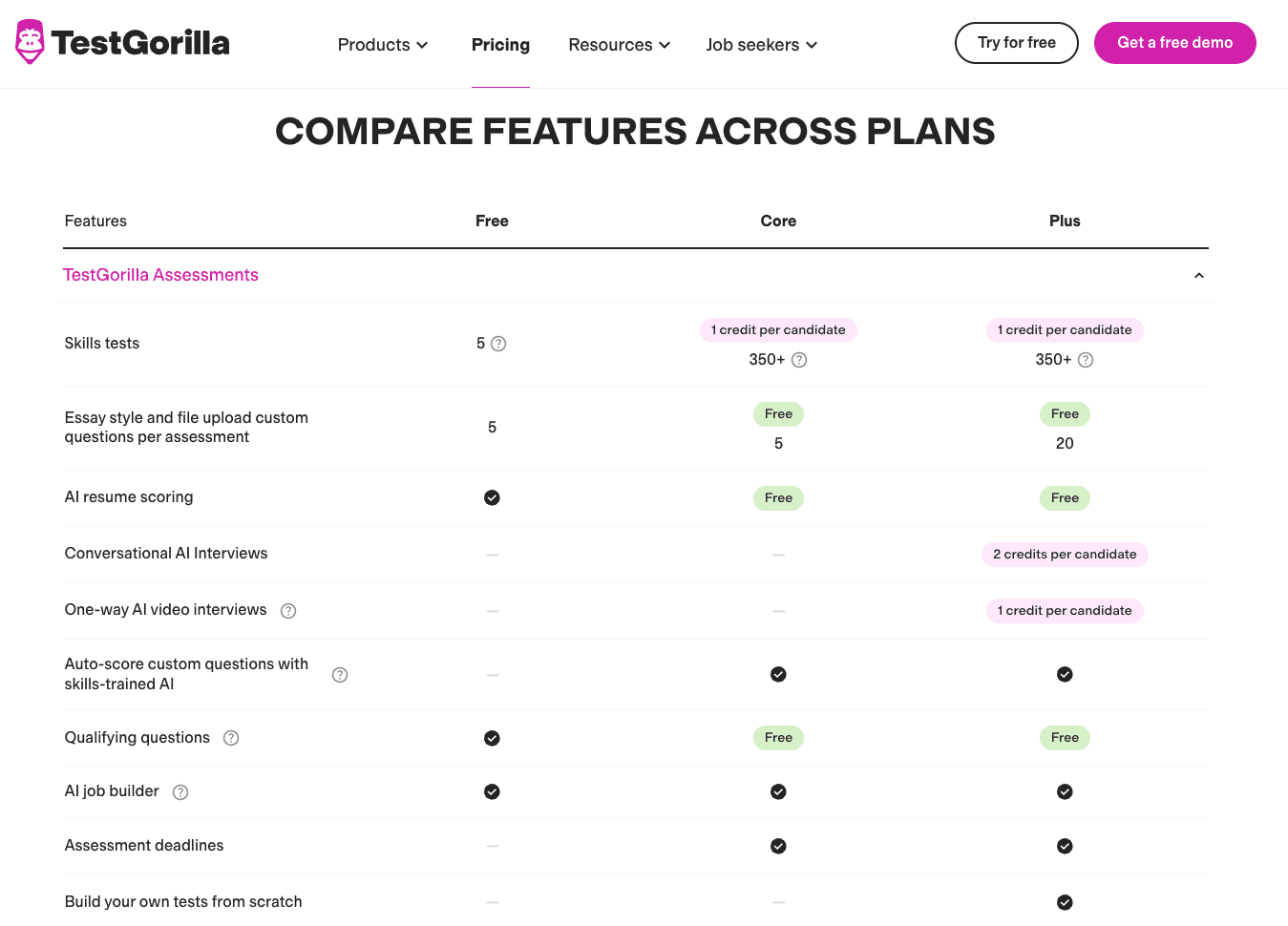 $69/month | 100 credits | Skills, Basic Personality | 15+ | Light hiring | ATS: +$2,388/year | |
