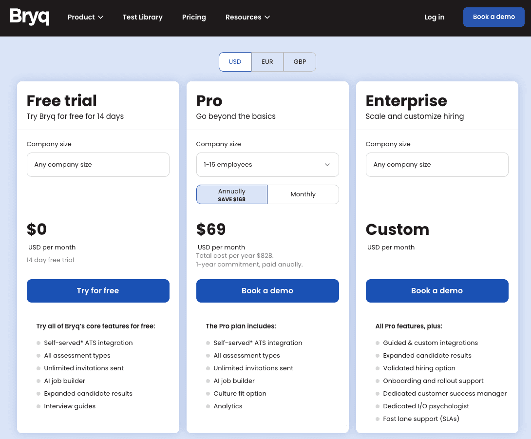 Bryq ($83/month): Unlimited assessments, comprehensive testing (skills + personality + culture fit), monthly billing
