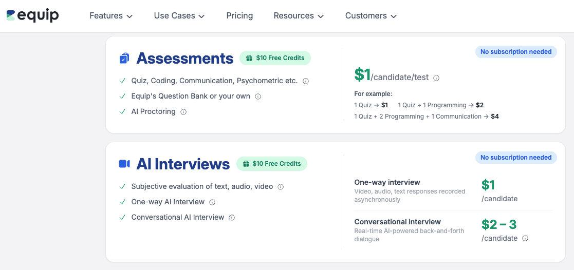 Equip ($1/candidate): Simple per-candidate pricing, good for technical roles with basic needs