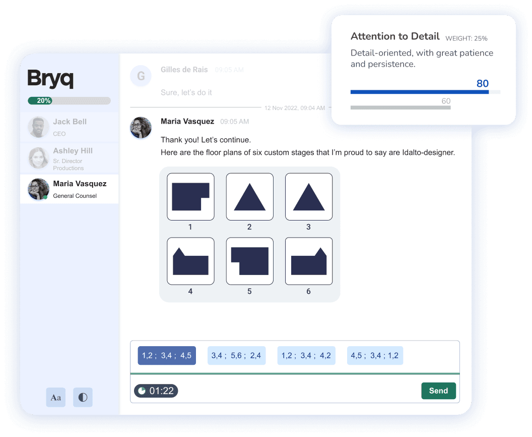 Most assessment tools test candidates without understanding the role they’re being hired for. Bryq’s AI is trained on millions of data points and analyzes the role itself to identify the skills and competencies that lead to success. Then it matches candidates to that profile, turning hiring into true match-making.