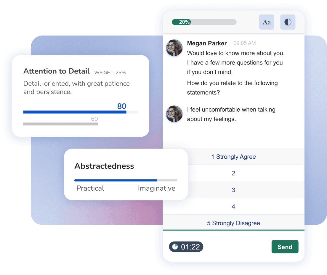A quick user-friendly assessment that takes under 30 minutes. No logins, no setup, no friction. Gamified design, mobile-friendly, and fully bias-free from start to finish.